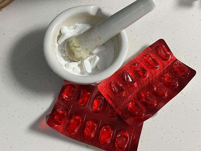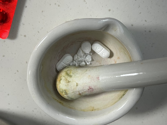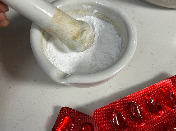 1. 비타민C 20알을 막자사발에 갈아 가루로 만들었다. (보통은 30알 추천하지만 너무 아까워서 타협)
