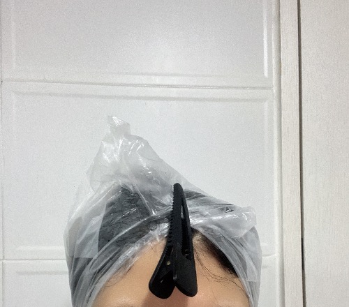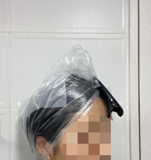 4. 비닐랩으로 머리를 감싼 뒤, 약 45분간 방치하며 반신욕.